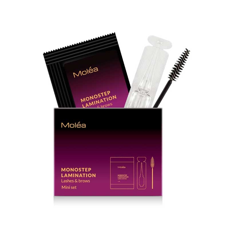 MOLÉA Mini set MonoStep lamination Molea is a mini kit based on the one-step ONE TOUCH MONOSTEP LAMINATION formula and a post-lamination care product. The formula gently modifies the hair structure and fixes it in the desired position while caring for it thanks to a complex of active nourishing components.